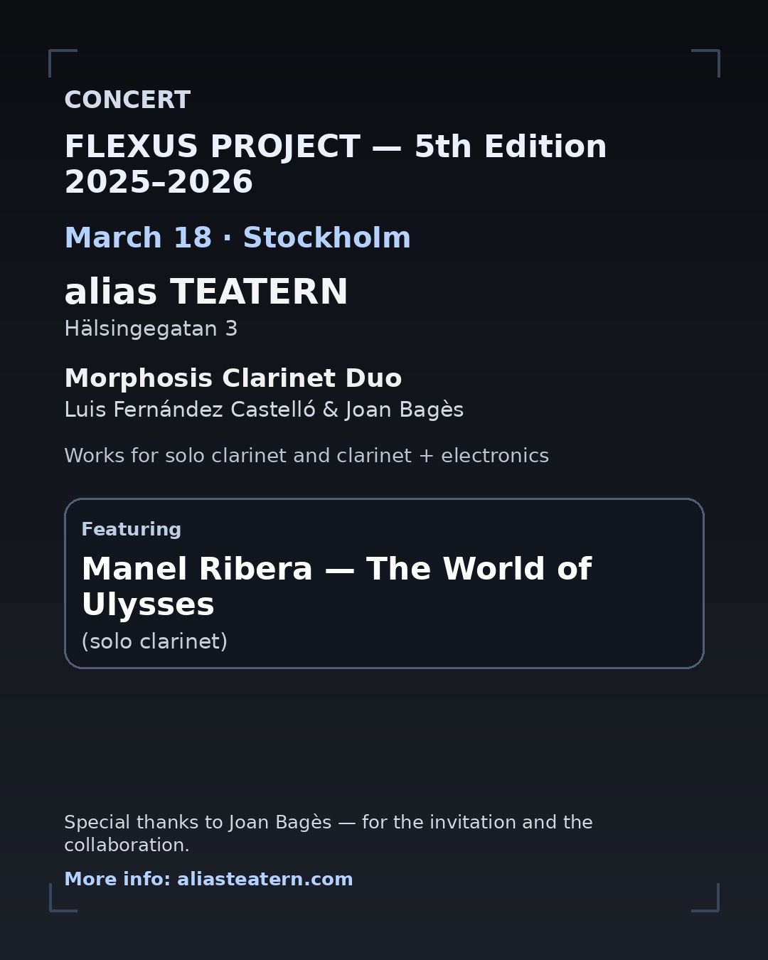 The UK premiere of my solo clarinet work "El món d'Ulisses"! Philip Edwards at the clarinet.25th London New Wind Festival https://www.londonnewwindfestival.co.uk Recitals of New Music for Solo Wind Instrument and PianoSaturday October 1st 2022 6.30pm.The Warehouse, 13 Theed St, London SE1 8ST